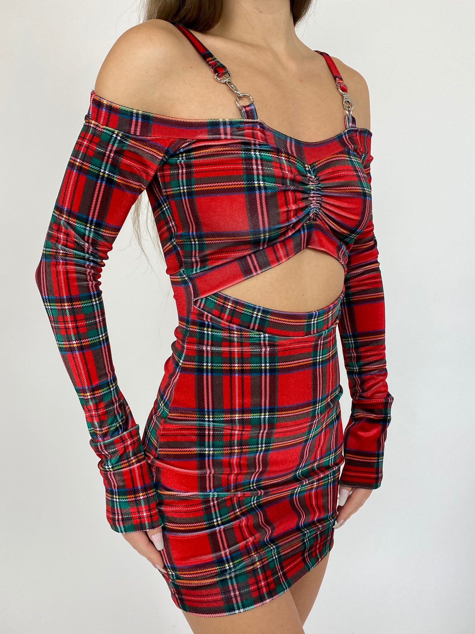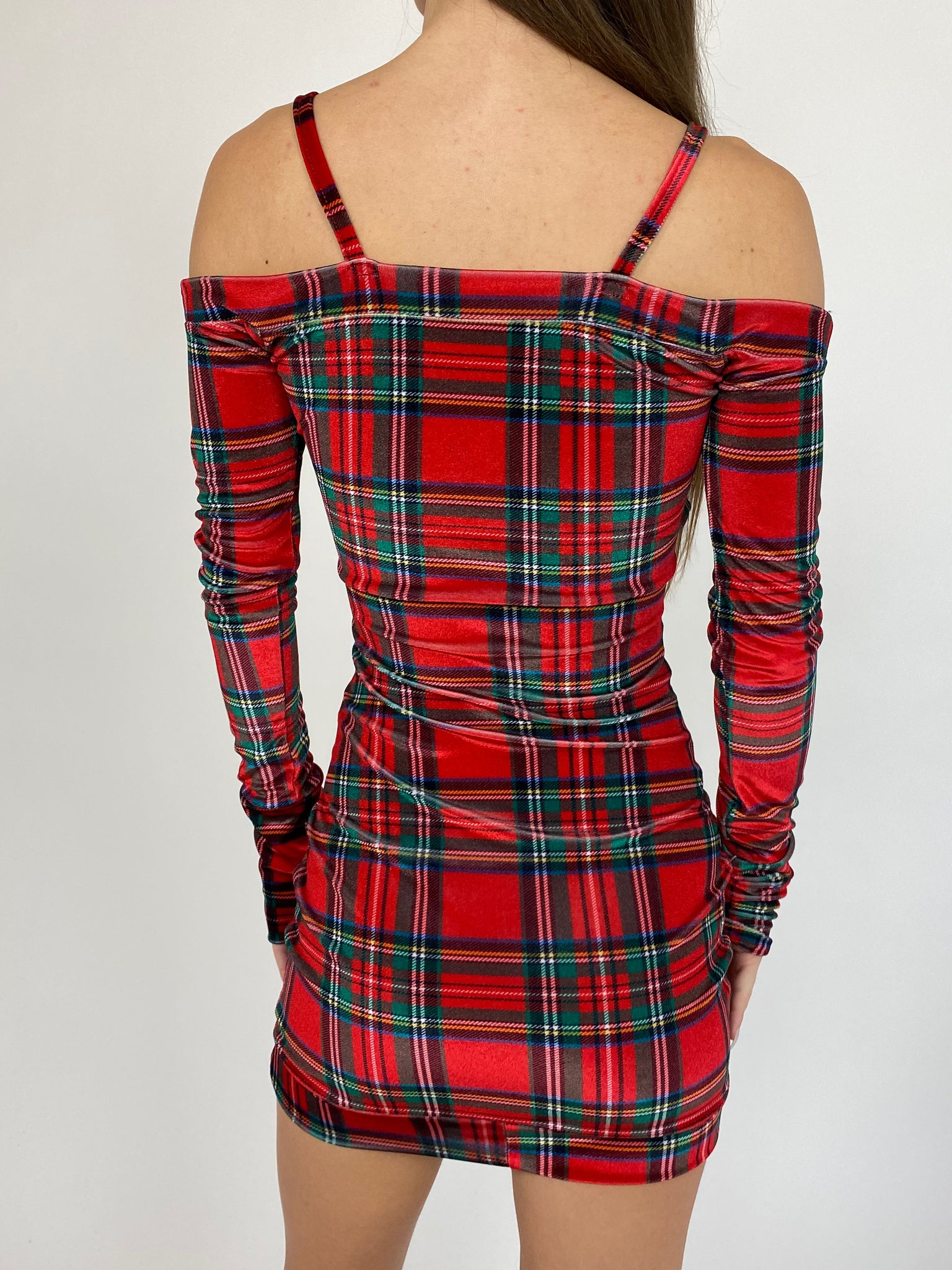 Rebel mini dress made from a red plaid stretch velvet.