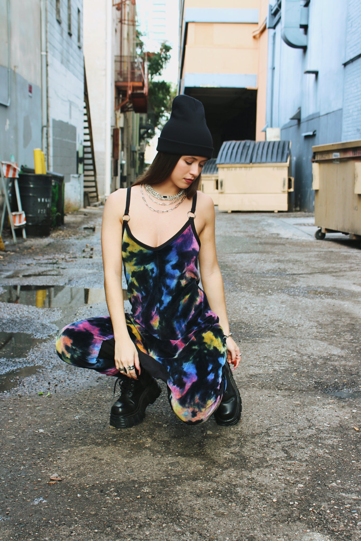 Each Jumpsuit is marbled with a unique blend of blue, pink, yellow, and black. Color placements may vary from product to product due to the nature of garment dying.