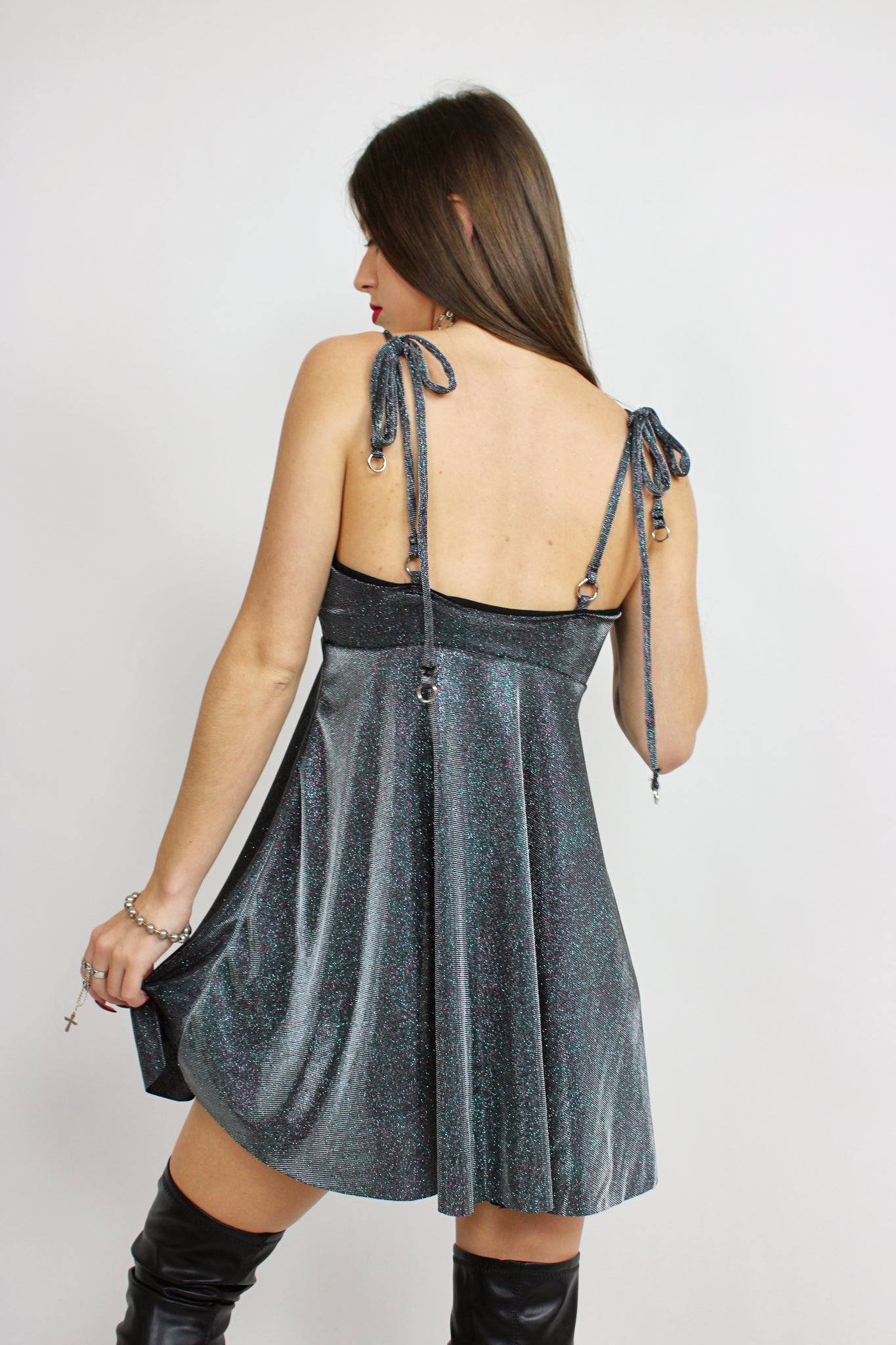Baby doll dress with long romantic bow tie straps in silver  sparkle with a pink and blue glimmer. Straps are functional and can be tied to your liking!