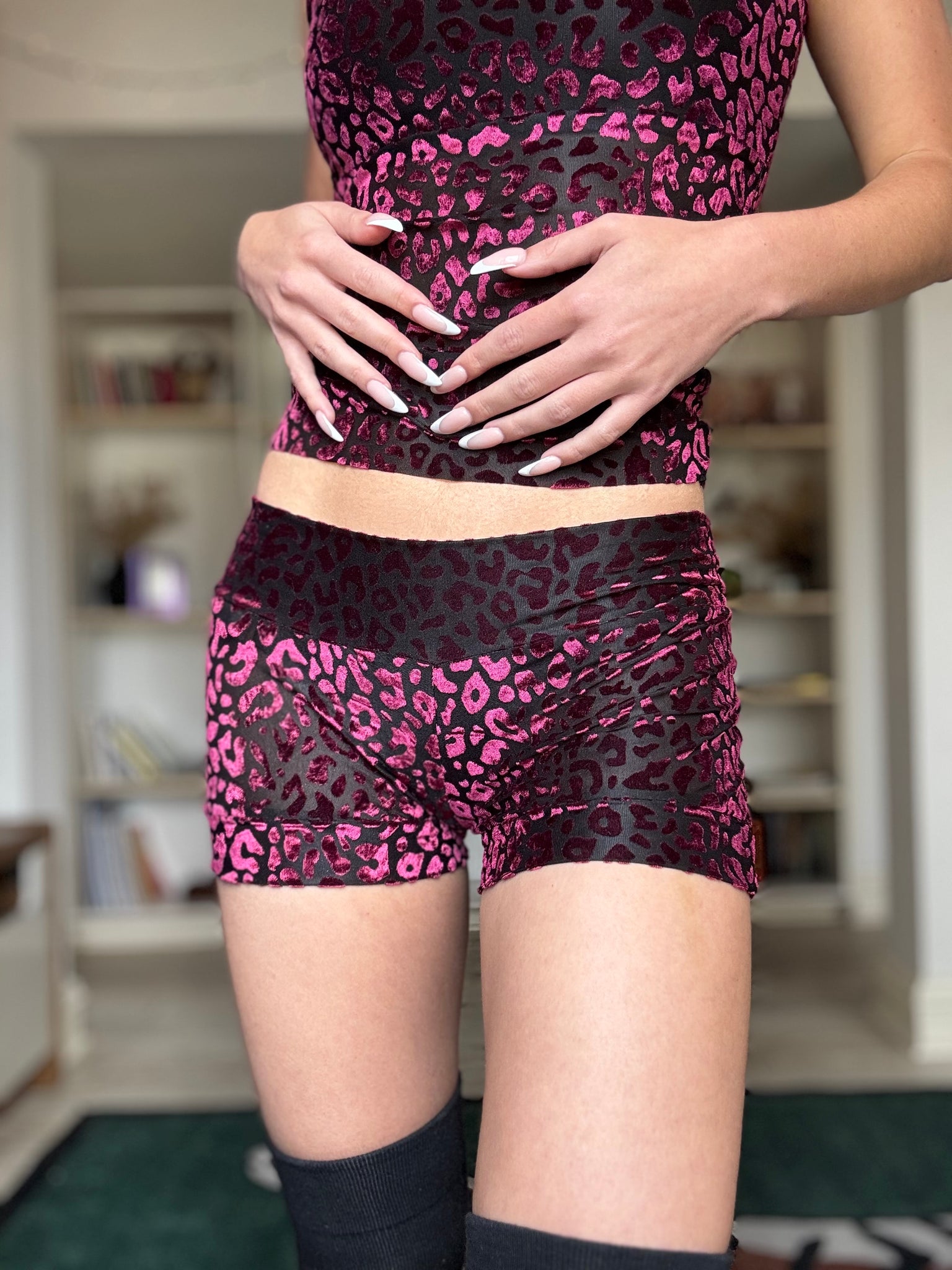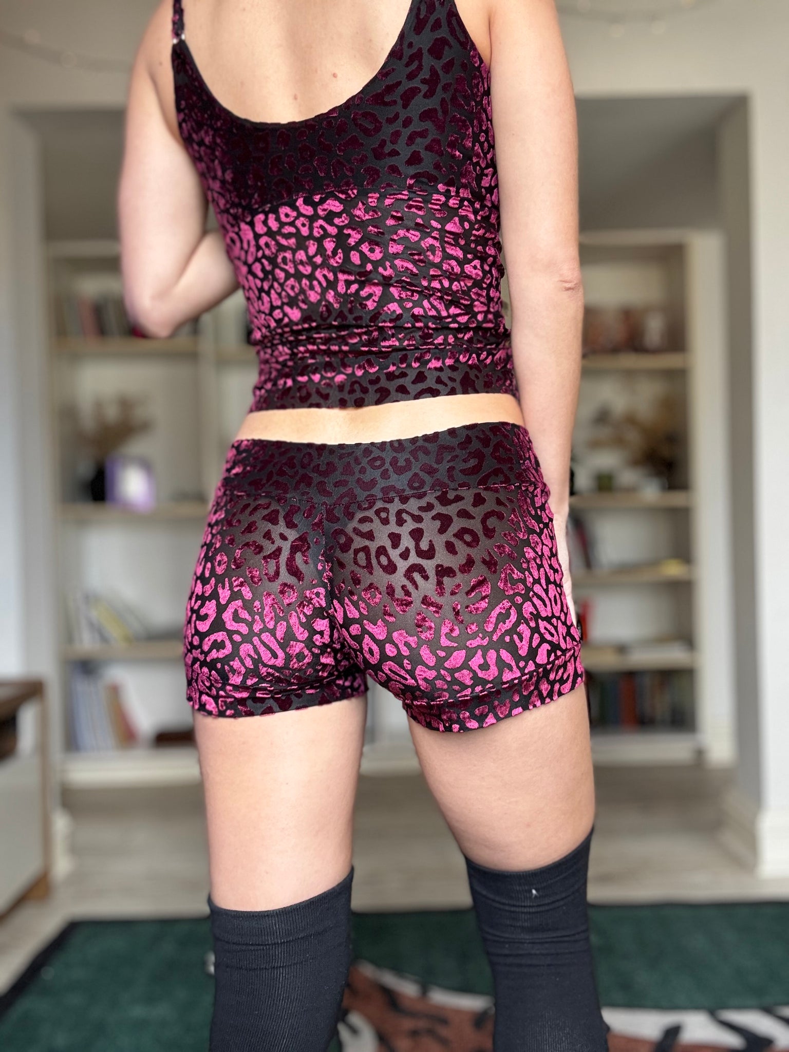 Burnout velvet stretch mesh shorts in a pink cheetah print overlayed on black mesh *slightly see through*