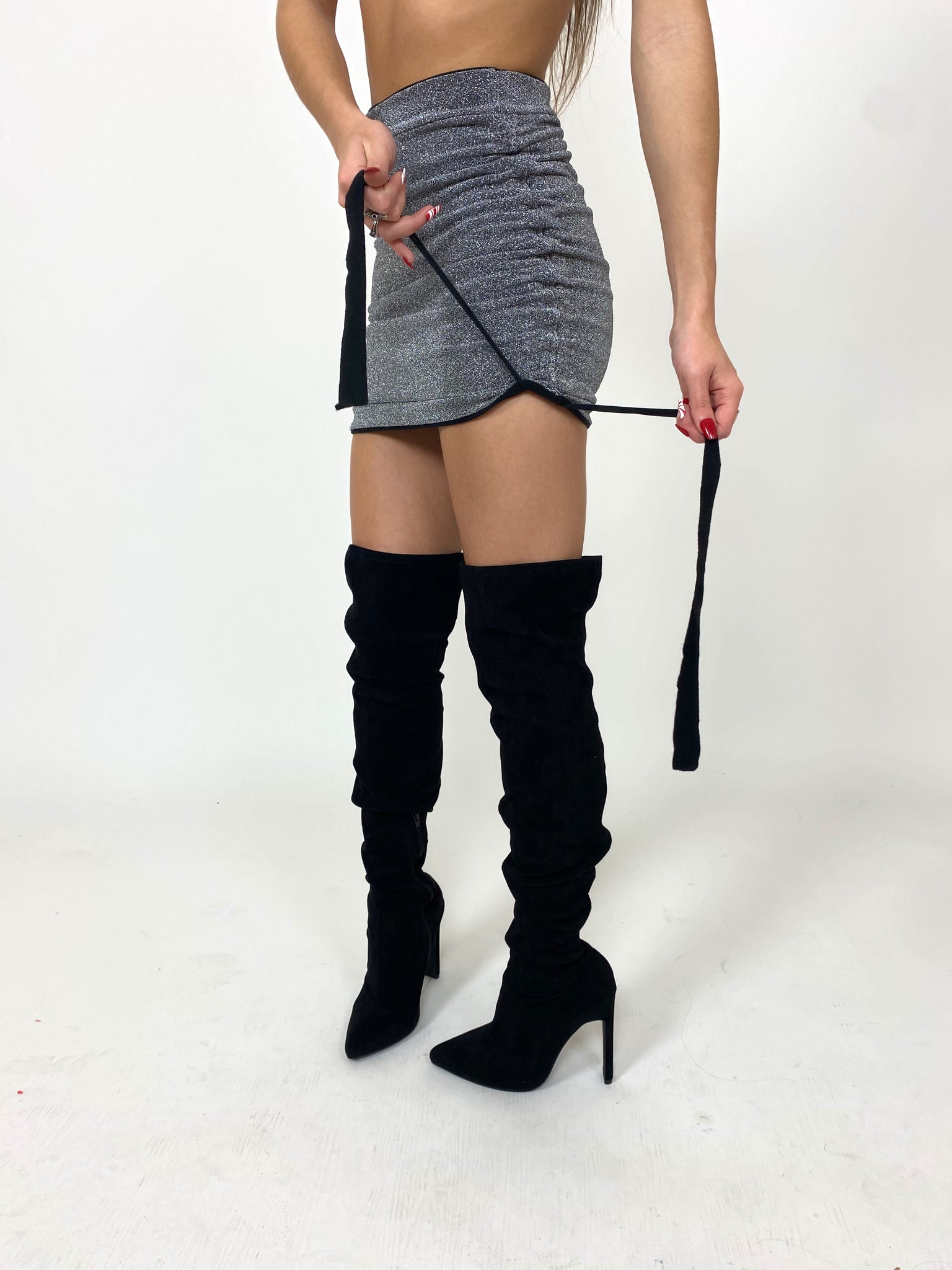 Our timeless and classic skirt, the cinch mini skirt in a limited edition silver sparkle lurex fabric! Fully lined in bamboo fleece so every part that touches your skin is super soft and nice.