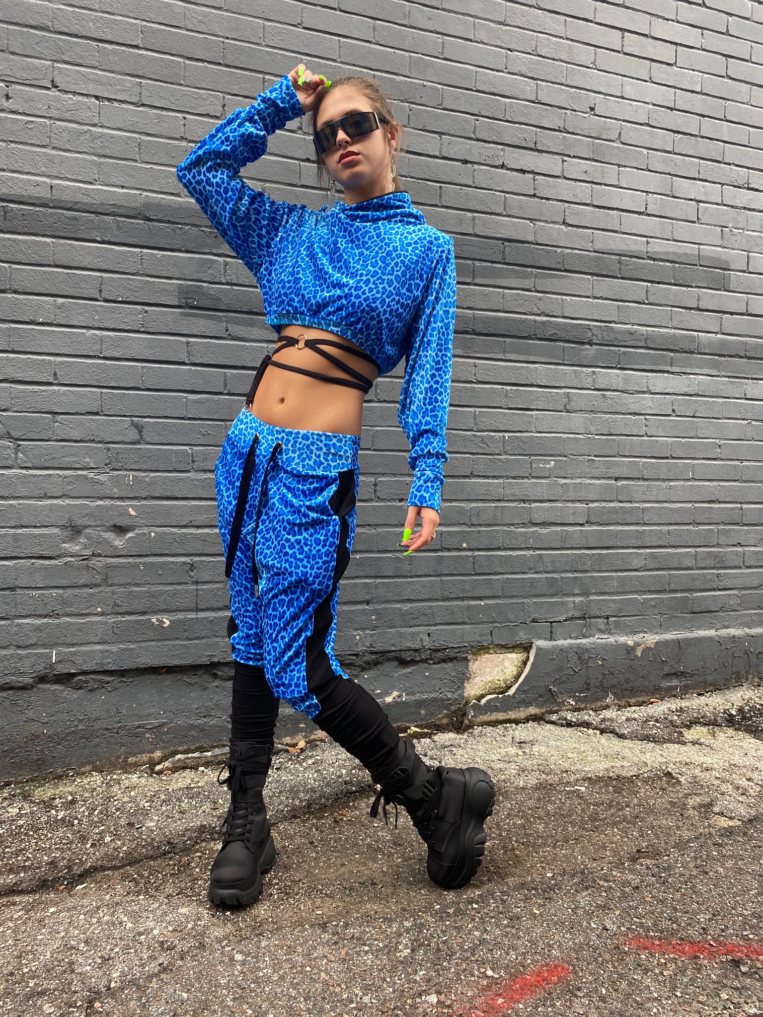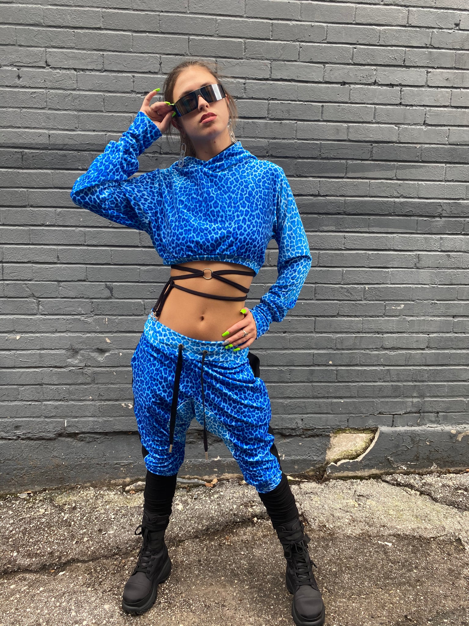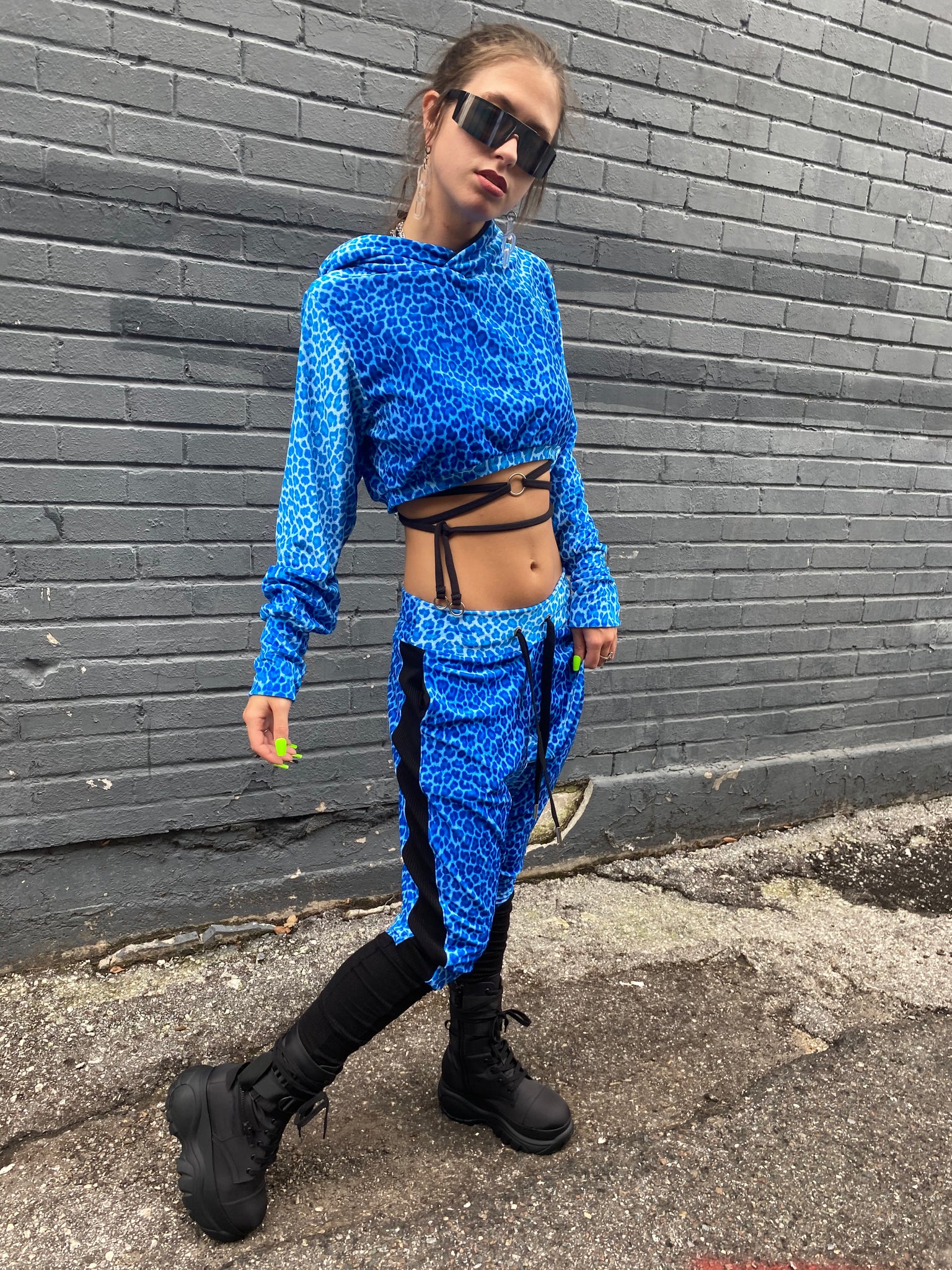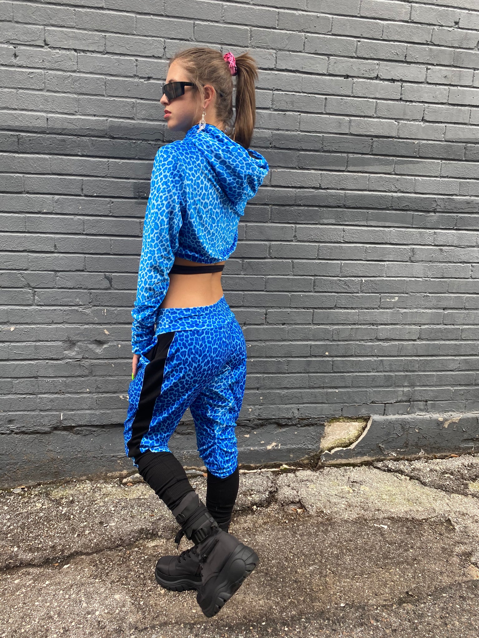 Available in both prints, double layered hood lined in black bamboo. Shown in blue cheetah.
